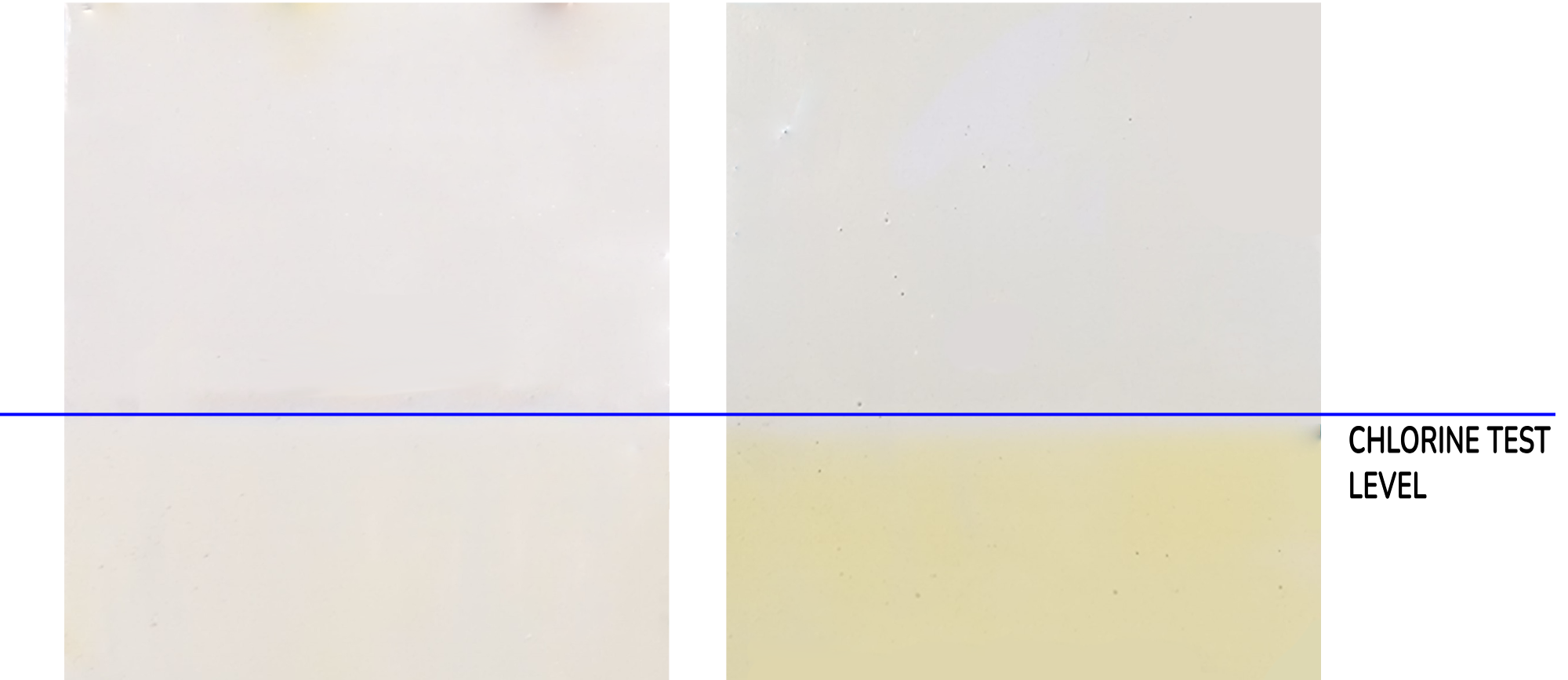The panel on the left, coated with Splash Armor epoxy, shows no visible discoloration or breakdown below the chlorine line.