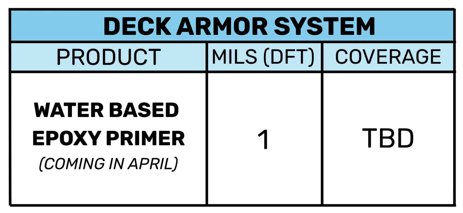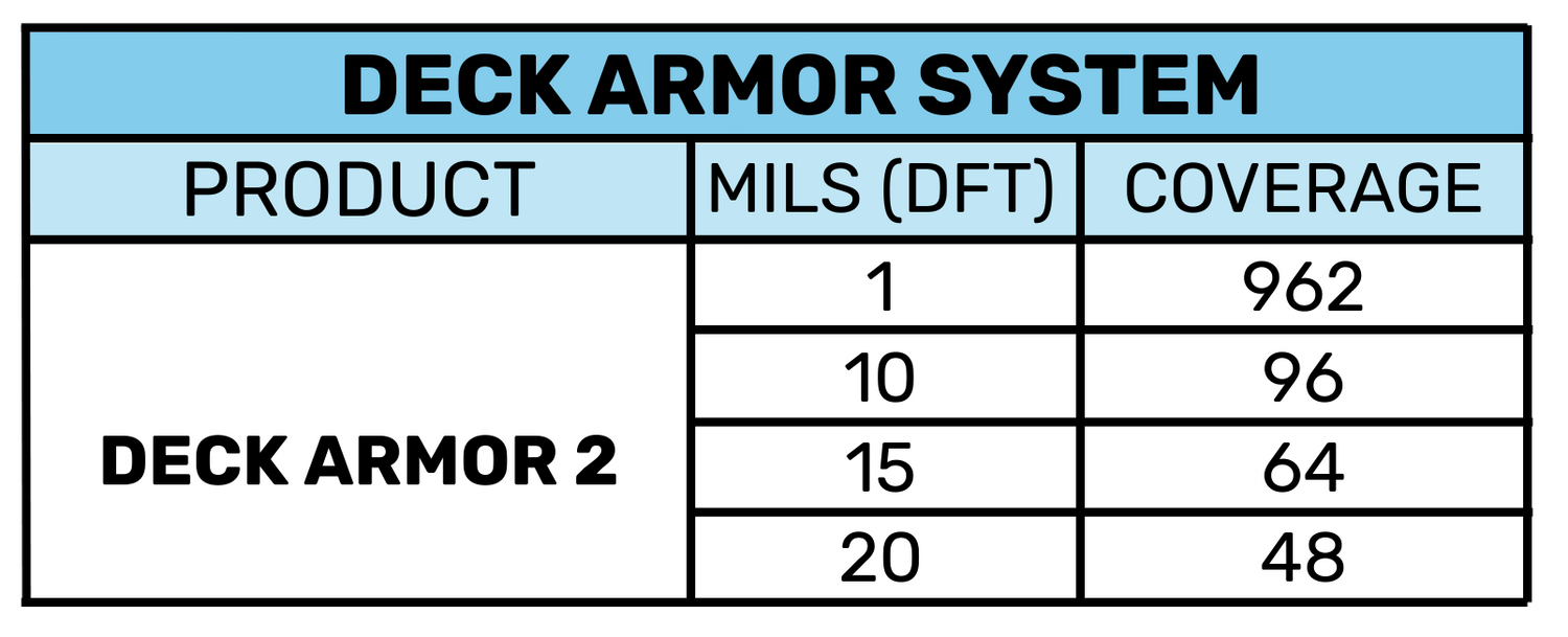 THE DECK ARMOR SYSTEM REQUIRES TO BE APPLIED IN TWO COATS.THE FIRST COAT CAN BE APPLIED 10-15 MILS AND IS DESIGNED TO PROVIDE A UNIFORM BASE. THE FINAL TEXTURED COAT SHOULD BE APPLIED AT A MINIMUM OF 20 MILS DEPENDING ON THE DEGREE OF TEXTURE NEEDED.