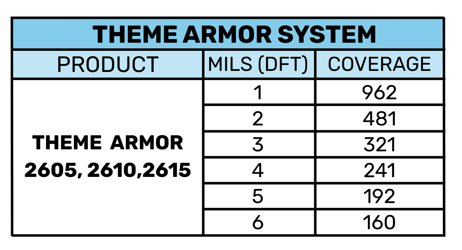 IN ORDER TO DETERMINE THE AMOUNT OF MATERIAL NEEDED, THIS CHART OUTLINES THE COVERAGE RATE AND THEORETICAL GALLONS NEEDED A DIFFERENT COATING THICKNESS LEVELS.