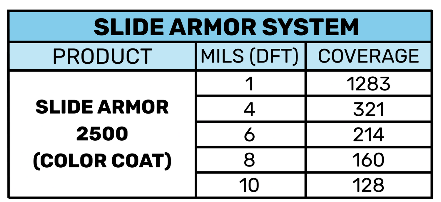 THE RECOMMENDED THICKNESS OF THE SLIDE ARMOR 2500 FOR THE INTERIOR OF SLIDE IS 8-10 MILS DFT . THE RECOMMENDED THICKNESS FOR EXTERIOR OF SLIDES OR FOR COATING FIBERGLASS PARTS IS 3-4 MILS DFT.